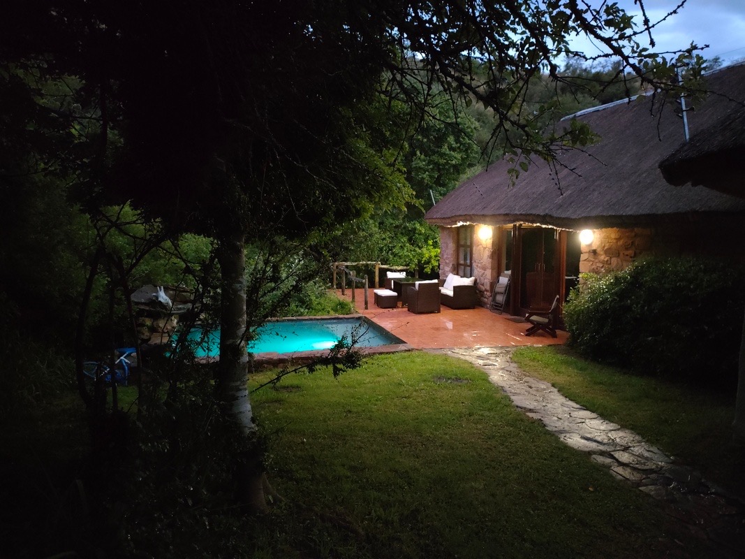 The entertainment area with its lounge and bar has a cozy fireplace for cooler evenings and on balmy evenings drinks and dinner can be served outside, below the African stars, around the "fire pit" underneath a thatched gazebo.